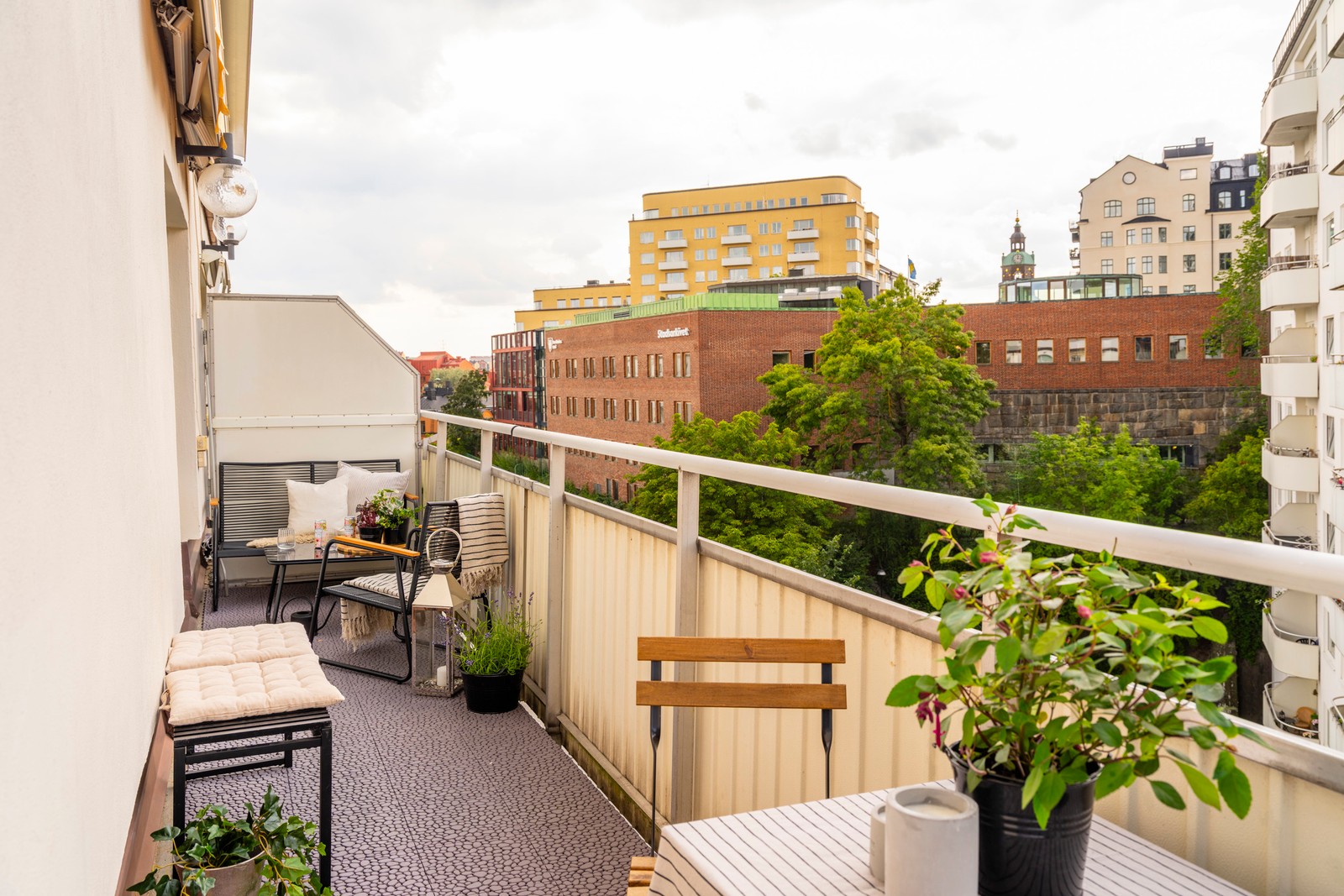 Ljus gaveltrea högst upp i huset med stor och solig kungsbalkong och sjöutsikt!