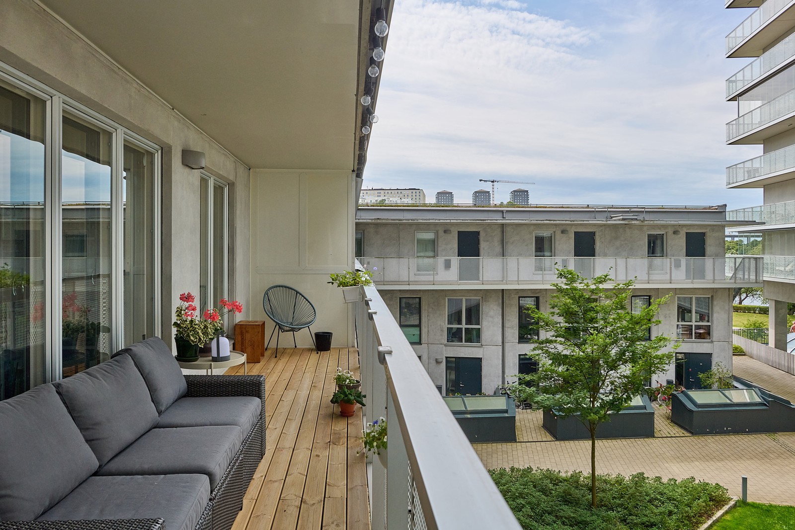 Välplanerad bostad med rymlig balkong mot innergård