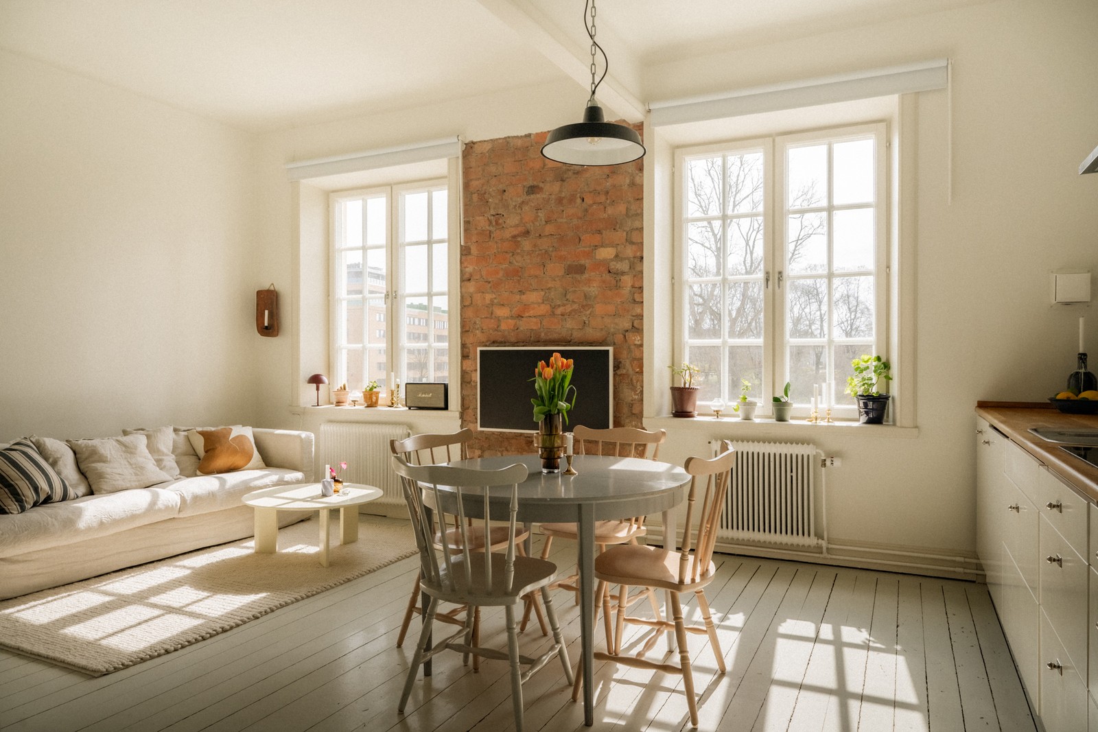 Här bjuds en inbjudande atmosfär och en generös takhöjd om cirka tre meter, vilket skapar en luftig och rymlig känsla. Bostaden är genomtänkt planerad med väl disponerade ytor, en rymlig hall och goda förvaringsmöjligheter i en praktisk walk-in-closet. Kök och vardagsrum samspelar i en öppen och social planlösning, medan sovdelen ligger mer avskilt och skapar en lugn och harmonisk sovmiljö. Här finns flera vackra originaldetaljer bevarade, såsom djupa spröjsade fönster, klassiska element och ett genomgående trägolv. Den framtagna tegelväggen tillför karaktär och ger en fin kontrast till de ljusa ytorna.