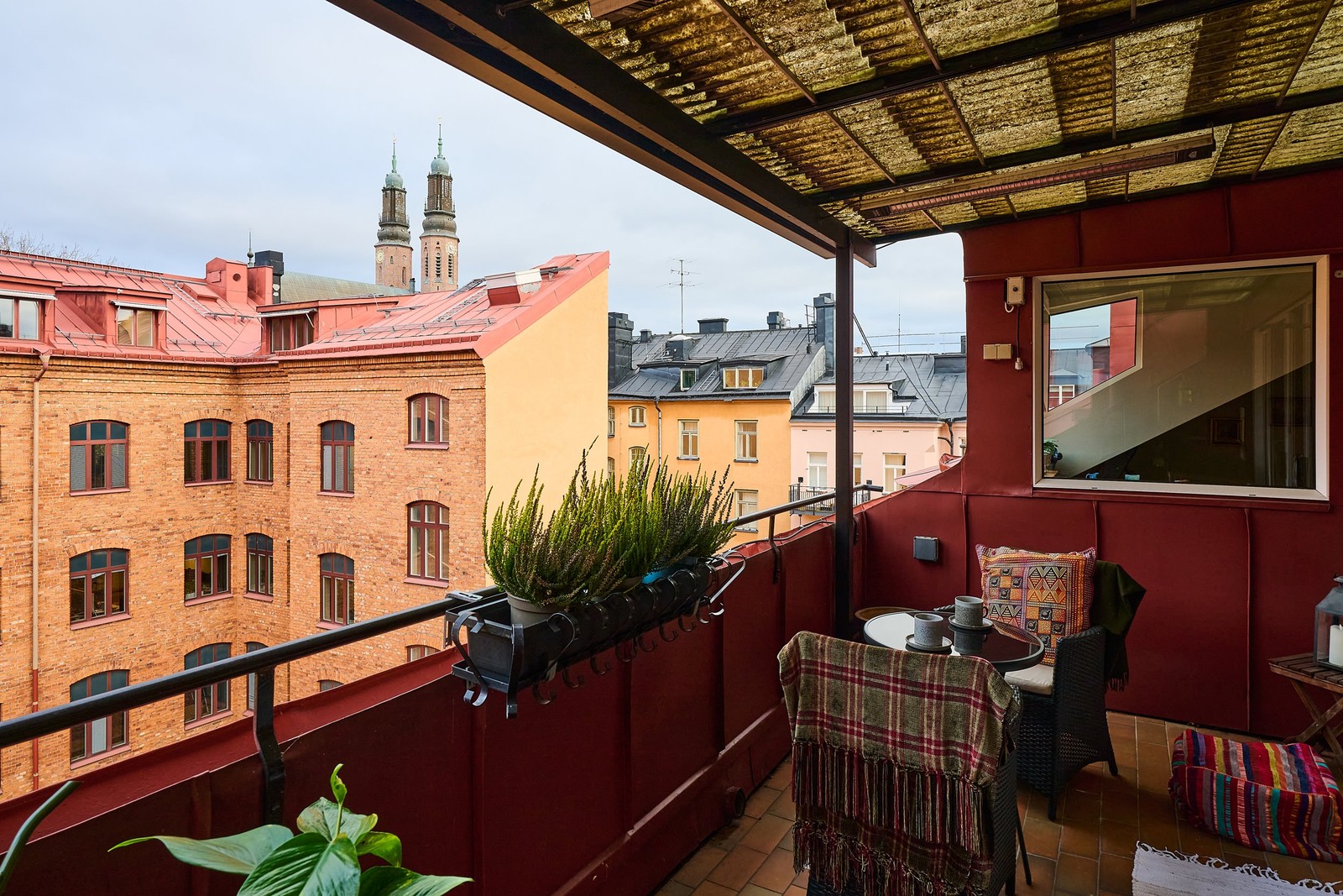 Charmig vindslägenhet med terrass, öppen spis och utsikt över Högalidskyrkan