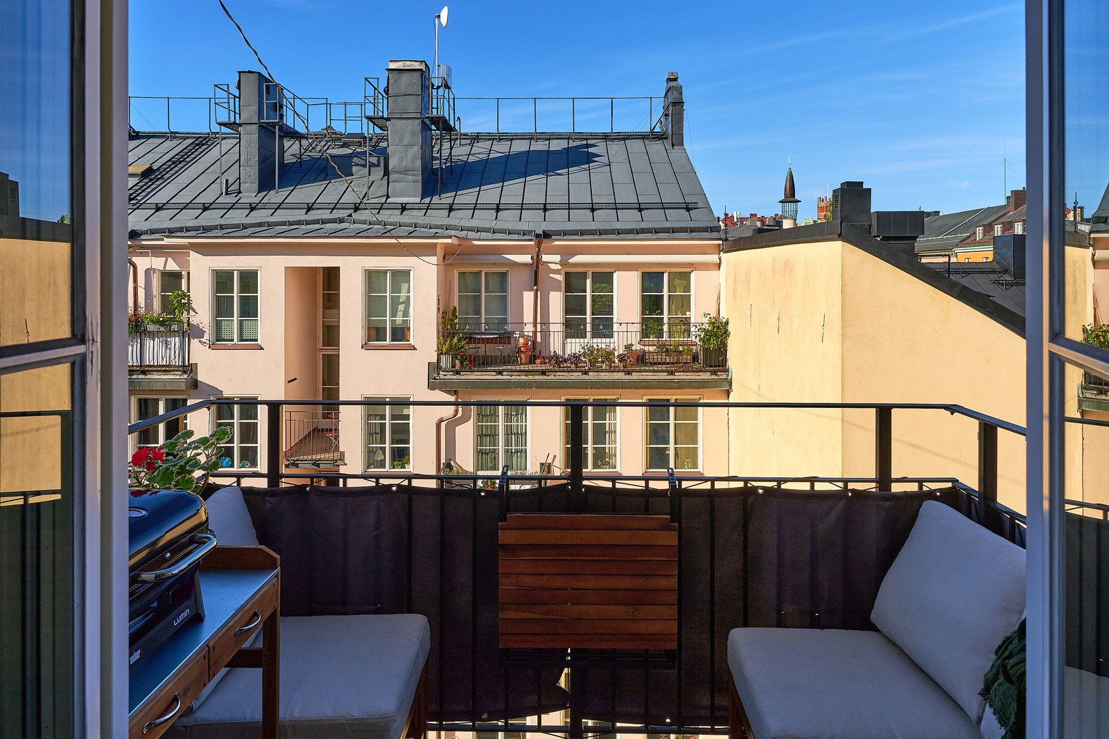 Ljus och välplanerad tvåa högst upp med härlig balkong och utsikt över takåsarna
