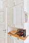 Hallen är rymlig och välkomnande med ett vackert brädgolv som sätter tonen för resten av bostaden. Väggarna är tapetserade och ger rummet en levande känsla. Här finns gott om förvaring i garderober samt plats för både byrå och hatthylla, vilket gör hallen både praktisk och trivsam.