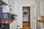 Köket är luftigt och präglas av ett vackert fönsterparti med spanjoletthandtag som släpper in rikligt med ljus. Brädgolvet och de vitmålade väggarna skapar en ljus bas som kompletteras av köksinredning med vita fronter och ett stänkskydd i mosaik. Här finns en bra arbetsbänk för matlagning och det bevarade serveringsskåpet ger både generös förvaring och en tidstypisk karaktär till rummet. Köket är utrustat med kyl/frys, spis, ugn, diskmaskin och fläkt, och det finns gott om plats för en matgrupp.