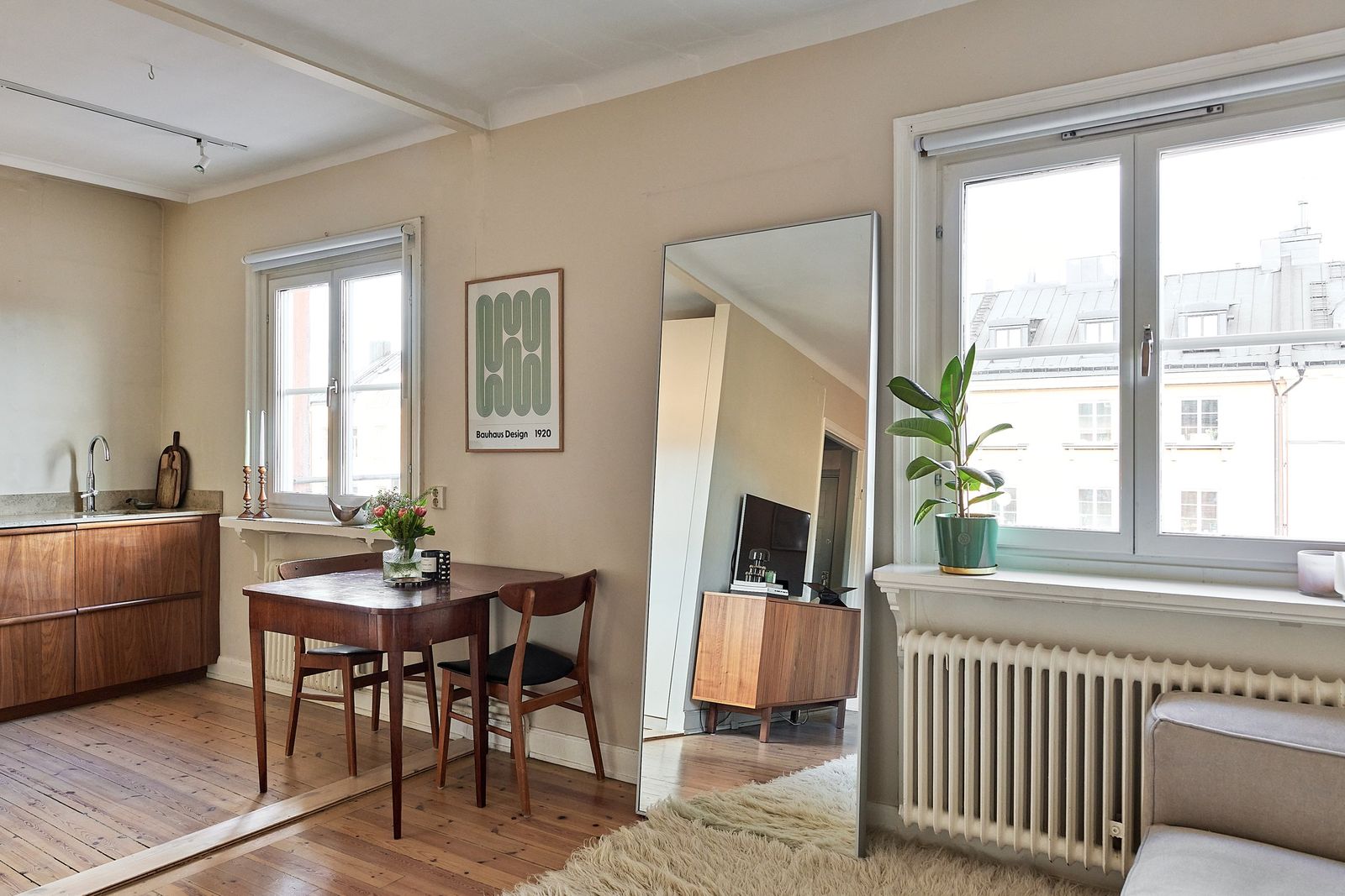 Högt läge med utsikt över takåsar och Sofia Kyrka präglas detta boende av välbevarad 20-talscharm!