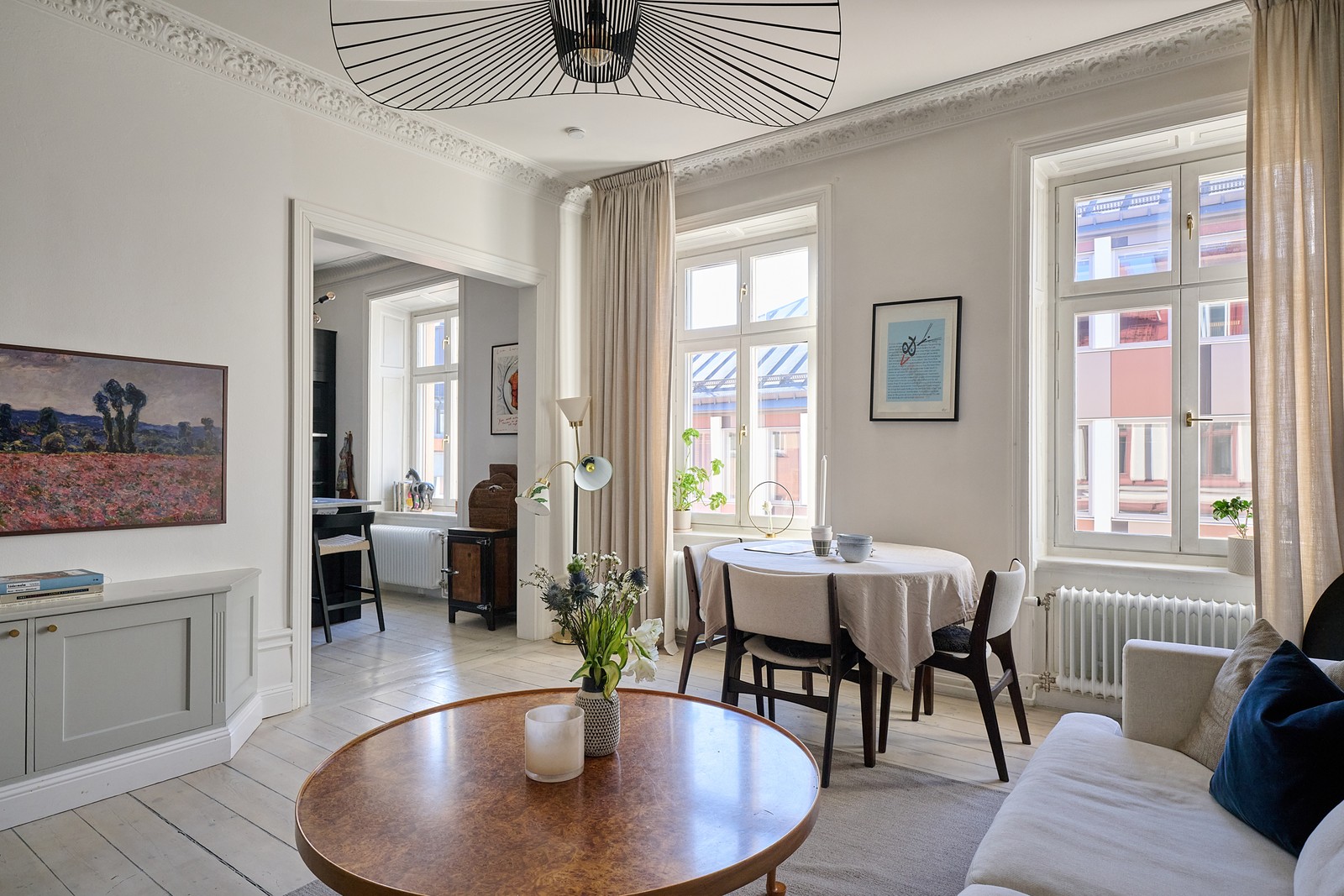 Högt upp i hus från 1882 med kakelugnar, balkong och utsikt över takåsar med Mosebacke som granne!