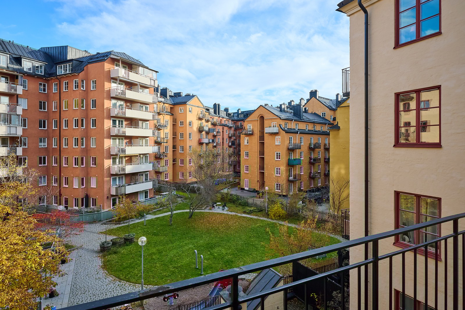 Luftig trea med parklik utsikt och solig balkong! Lugnt läge mellan två innergårdar.