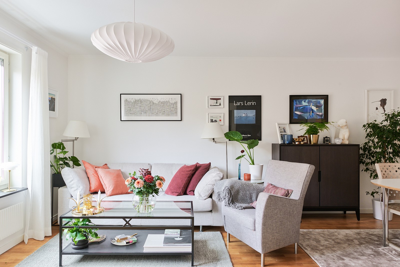 Ljust och väl tilltaget vardagsrum med öppen planlösning till kök inbjuder till socialt umgänge med många gäster. Generöst ljusinsläpp via stort fönsterparti i öster. Fönsterbrädor i svart marmor. Rogivande utsikt över Södermannagatan, populära restaurangen Greasy Spoon och trädgårdar runt intilliggande 20-talsfastigheter. Stora möblerbara ytor för soffmöblemang, matsalsgrupp, sideboard mm.