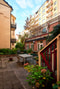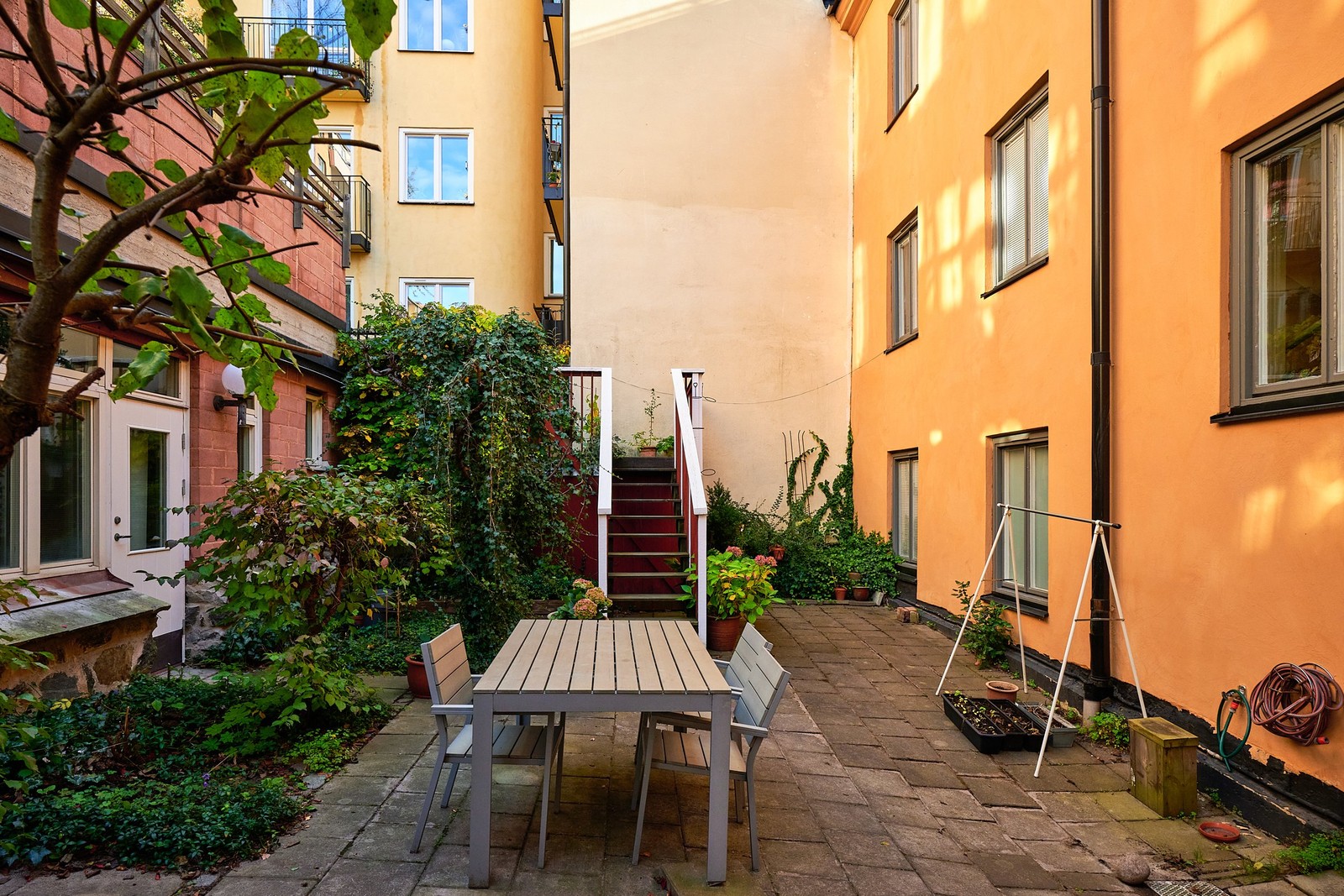 Härligt lummig, omsluten innergård med två uteplatser. Här kan du grilla med vänner eller odla tomater på den upphöjda lilla terrassen. Under denna finns även ett cykelförråd.