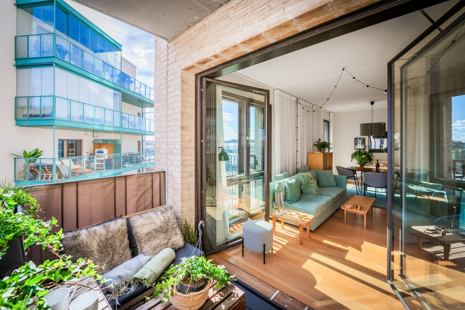 Lägenhetens absoluta hjärta är den spektakulära balkonglösningen som öppnas upp helt mot vardagsrummet och skapar en närmast magisk indoor-outdoor-känsla. Under årets varmare månader suddas gränsen mellan bostad och balkong ut och hemmet fylls av ljus. Balkongen nås dessutom direkt från sovrummet, vilket skapar en lugn atmosfär där morgonkaffet kan avnjutas med öppna glaspartier och stadens liv precis utanför.