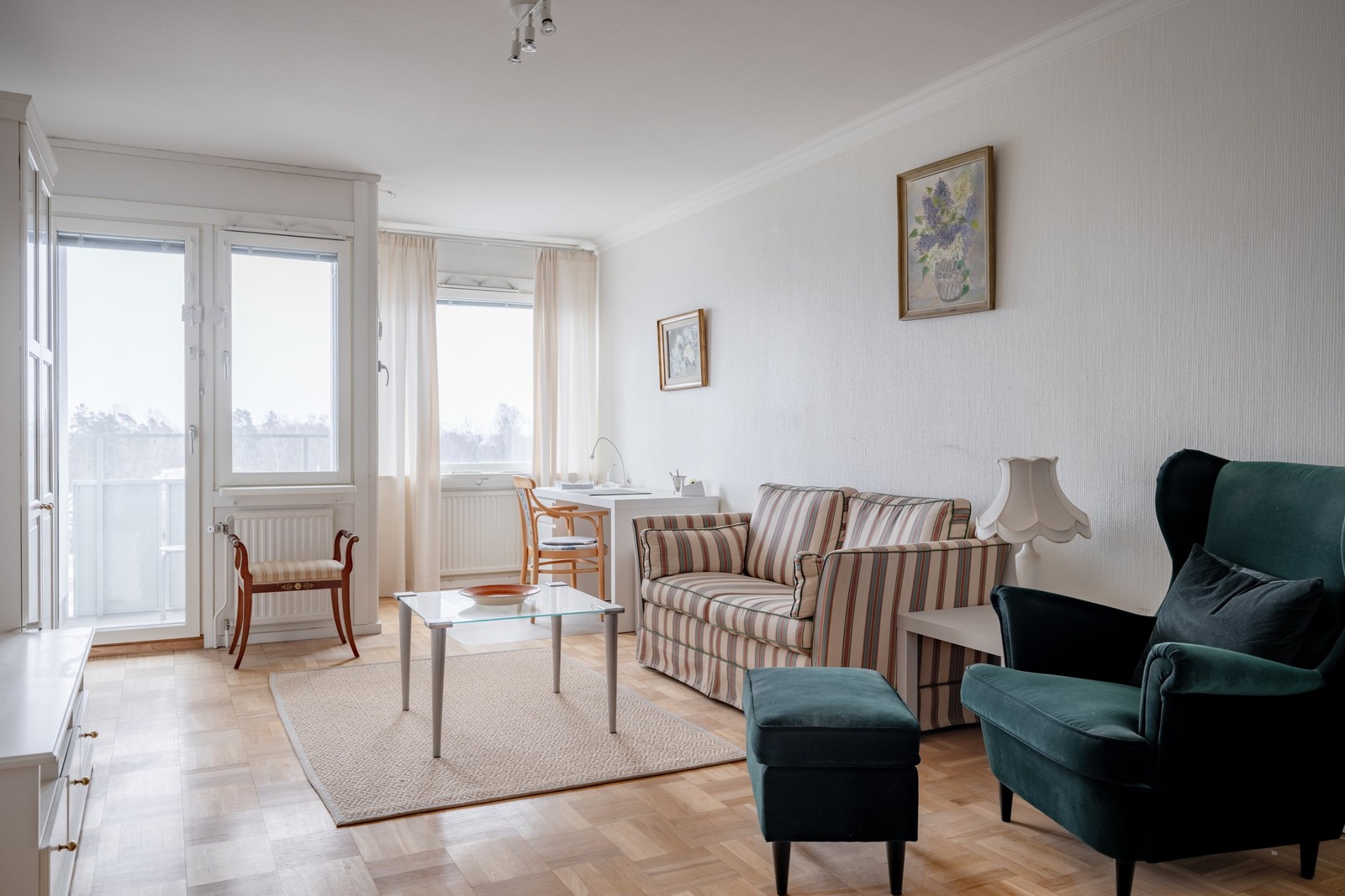 Bostaden har mycket av den genuina charmen kvar från byggåret 1958 med stora fönster som ger ett härligt ljusinsläpp och vackra fönsterbänkar i sten. Interiören består av mycket stilsäkra färger och materialval. Klassiskt charmigt kök i gott skick med rostfri arbetsyta. Planlösningen är väldigt bra med sovrum i ena änden av bostaden, kök i mitten och ett vardagsrum i andra änden. Balkong i fritt läge. Helkaklat badrum i fint skick med tvättmaskin. Lägenheten har dessutom mycket gott om förvaringsutrymmen. I den bortre delen är det i dagsläget avdelat till 1rok med egen balkong och ingång, men det går enkelt att öppna upp.