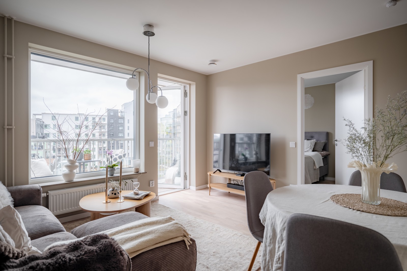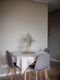 Vardagsrummet rymmer både soffgrupp och matplats. Vacker ekparkett samt ljust, målade väggar.