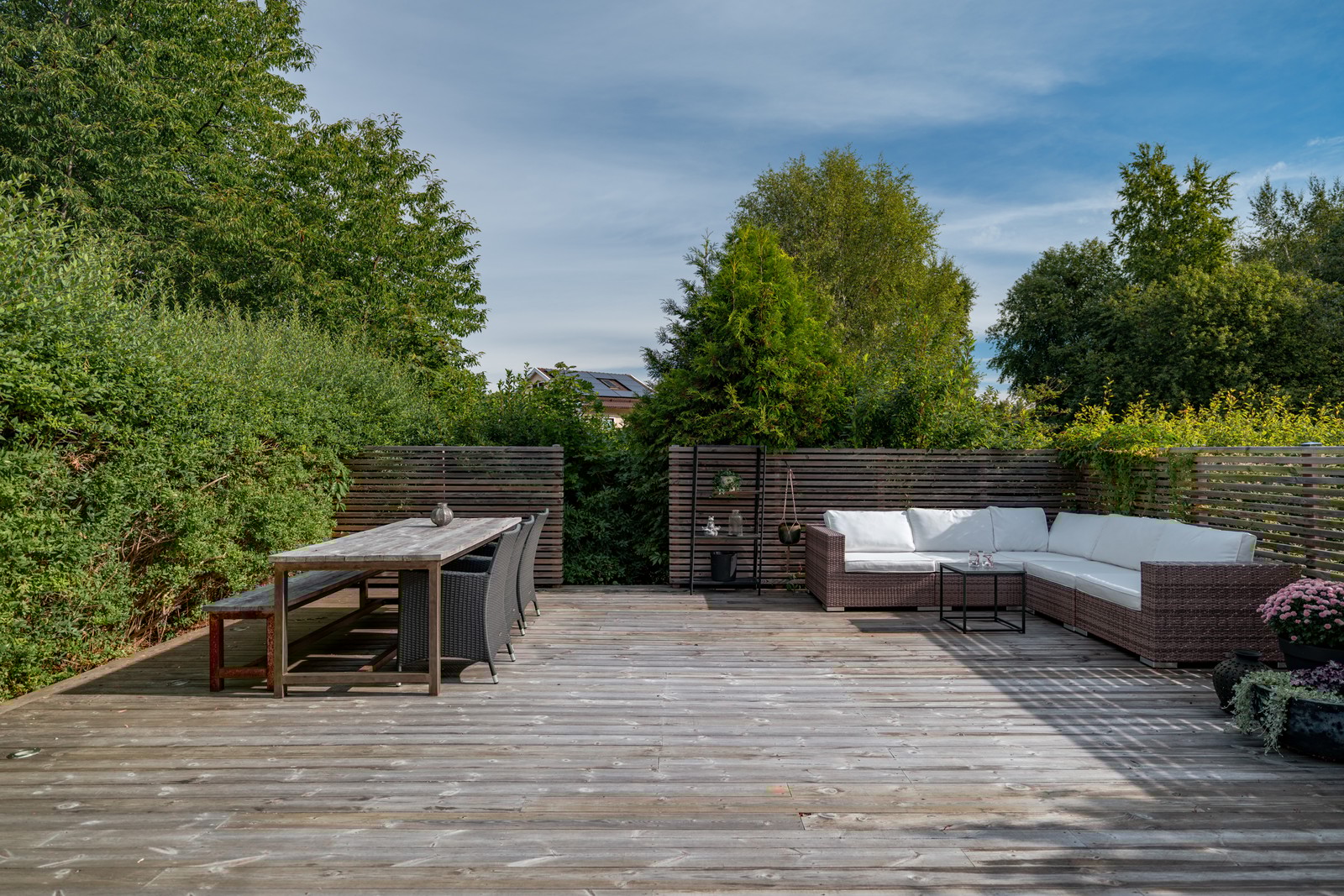 På husets baksida hittar du en stor, insynsskyddad uteplats i soligt läge – en grön oas där du kan njuta av solen från morgon till kväll. Perfekt för grillkvällar, lek eller lugna stunder i det gröna.