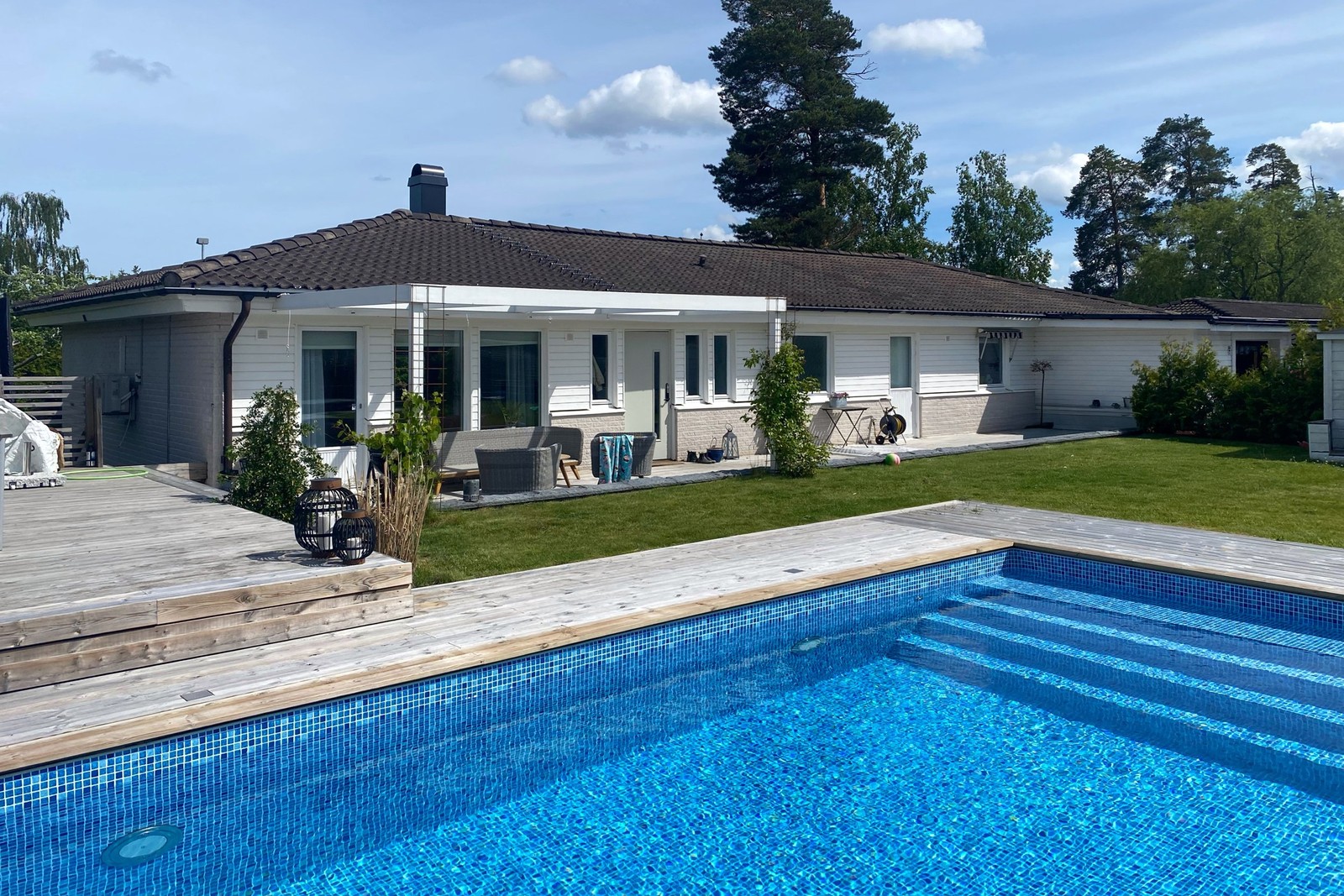 Den plana och välskötta trädgårdstomten bjuder på stora altaner med gott om plats för umgänge, avkoppling och middagar i solen. Här finns både pool och utespa – en privat oas för njutning året om. Det höga läget ger ett fritt och insynsskyddat boende med härliga soltimmar från tidig morgon till sen kväll.