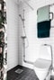Badrum 2 i helkaklat utförande., vitt kakel och klinker i grå nyans ger ett modernt intryck. Badrummet är utrustat med en wc-stol, handfat med kommod, spegel, handdukstork samt tvättmaskin.