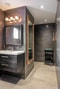 Elegant badrum med stilrent kakel i mörka toner och lyxiga detaljer. Utrustat med handfat med kommod, spegelskåp, duschhörna och smakfull belysning.