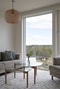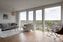 Vardagsrummet är rymligt och ljust med stora fönsterpartier som ger en fantastisk utsikt. Här finns plats för både soffgrupp och mediamöbler. Golvet är i ljus ekparkett som harmoniserar med den neutrala färgpaletten på väggarna.
