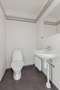 Entréplanet rymmer även en separat gästtoalett med handfat, toalett, vitmålade väggar och en gråsvart våtrumsmatta. Ett praktiskt och snyggt komplement till badrummet.