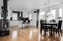 Allrummet binds samman med det öppna köket där en arbetsbänk avgränsar och fungerar som en praktisk köksö. Köket är fullutrustat med diskmaskin, spis med ugn, kyl och frys samt en modern fläktkåpa. De vita snickerierna skapar en ljus och tidlös atmosfär, och den smart integrerade förvaringen i väggen bidrar till en välplanerad helhet.
