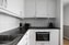 Ljust och funktionellt kök med vita skåpsluckor, svart bänkskiva och vitt kakel. Fullt utrustat med kyl/frys, diskmaskin, spishäll, ugn och fläkt. Gott om arbetsyta och förvaring i både över- och underskåp. Öppen planlösning mot vardagsrum med plats för matbord.
