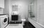 Helkaklat badrum med svart klinkergolv och vita väggar. Utrustat med WC, tvättställ med kommod, spegelskåp samt badkar med duschvägg. Tvättdel med tvättmaskin, torktumlare, bänkyta och överskåp.