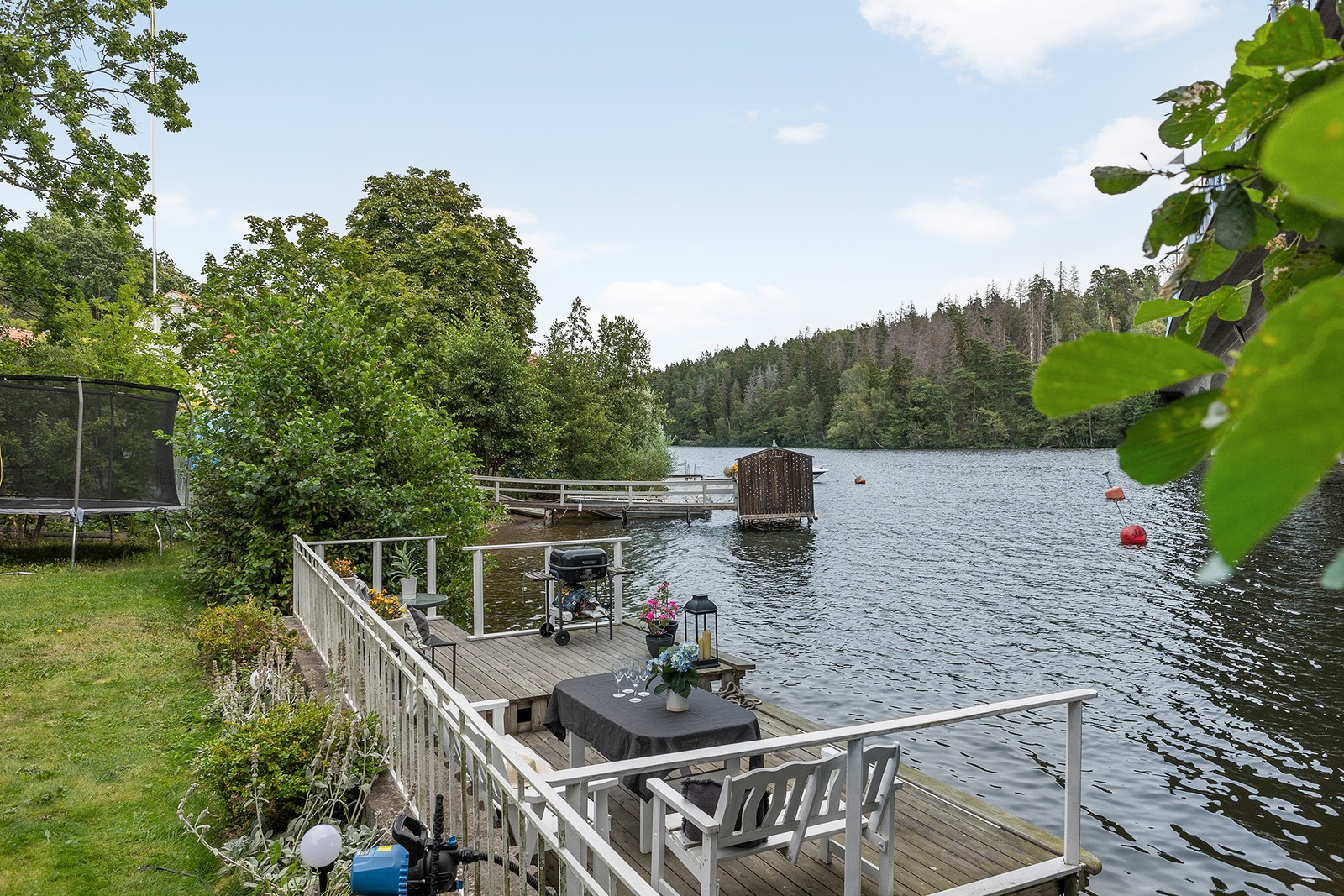 Utanför villan finns föreningens gemensamma gräsytor och nere vid vattnet föreningens egna brygga.