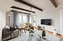 Ljust och trevligt rum som naturligt kan delas in i en matplatsdel och en yta invid fönstret som har plats för soffgruppen. Även här finns takbjälkarna tillsammans med väggar målade i sandbeige ton och det framtagna furuplankgolvet. Utgång till takterrassen.