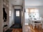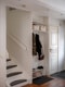Hall med parkettgolv och ljusa väggar. Uppgång till vind.
