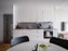 Parkettgolv och ljusbeiga väggar. Vita släta köksluckor och grått stänkskydd ovan arbetsytor i grå laminat. Spishäll, ugn, integrerad diskmaskin, integrerad fläktkåpa och kyl/frys. Matplats för 4-6 personer med öppen planlösning mot vardagsrummet. Ett linneskåp och ett städskåp.
