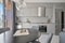 Ljust och luftigt rum med vitpigmenterat trägolv och gråmålade väggar. Sovalkov med industriglasvägg skapar en avskild sovdel. Gott om plats för både soffa och matbord. Stort skjutbart glasparti leder ut till bostadens balkong och ger ett generöst ljusinsläpp.