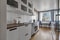 Modernt kök med eleganta vita skåpluckor och praktiska arbetsytor i laminat. Köket är fullt utrustat med spishäll, fläkt, ugn, mikrovågsugn samt kyl och frys. Vid fönstret finns en rymlig matplats som rymmer 4–6 personer och ger ett härligt ljusinsläpp. Härifrån finns även ingång till badrummet. Parkettgolv i kombination med vita väggar skapar en ljus och inbjudande atmosfär.
