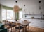 Parkettgolv och gröna målade väggar. Öppen planlösning mellan kök och vardagsrum med både plats för stort matbord och soffgrupp. Stora fönsterpartier ger ett härligt ljusinsläpp.