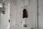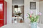 En inbjudande och rymlig hall med ljusa väggar med vitmålad bröstpanel., elegant vitmålat trägolv och generös takhöjd. Praktisk avhängning finns till vänster i hallen.