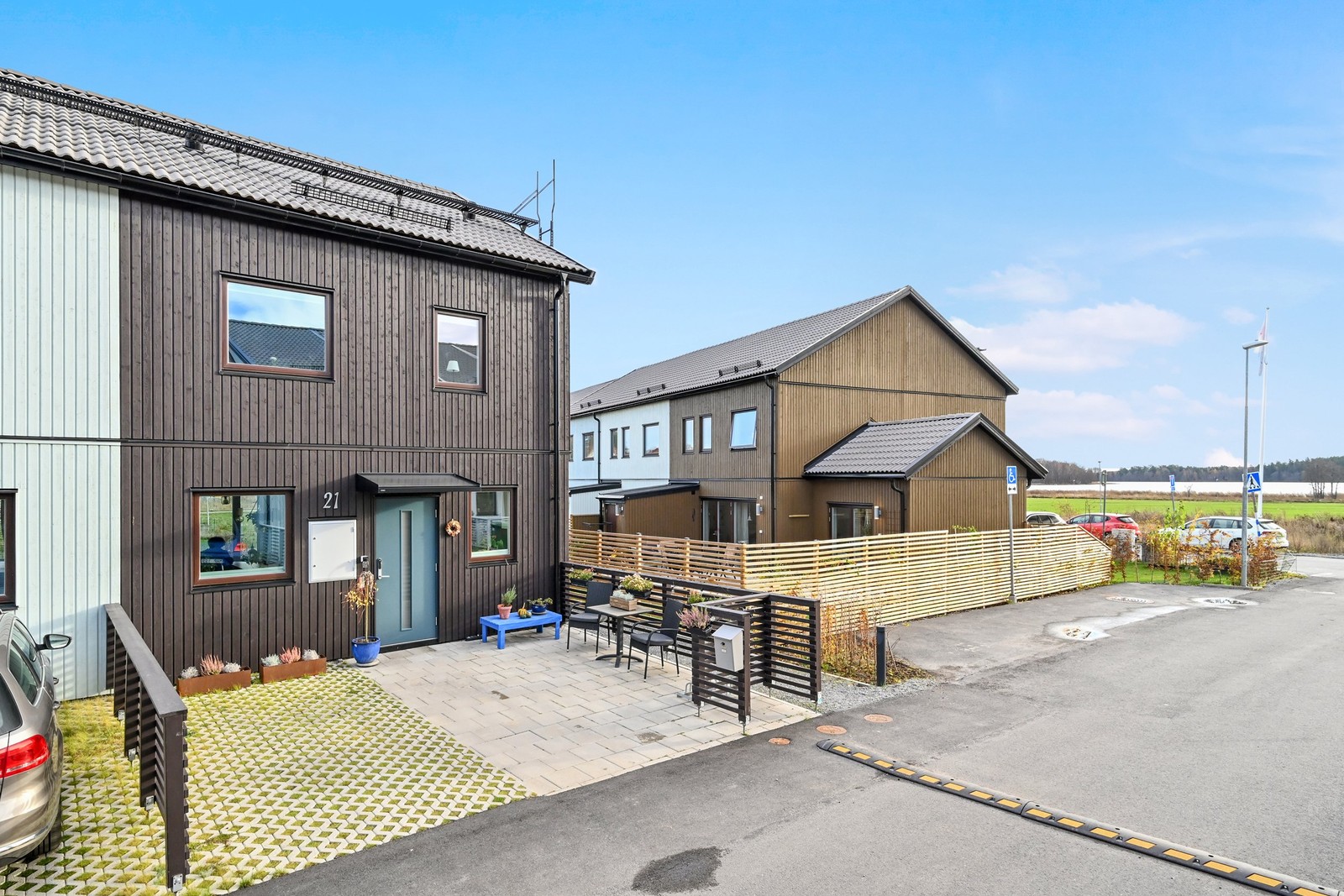 Varje radhus har en tillhörande parkeringsplats i anslutning till huset. Utöver detta finns 5 gästparkeringar samt besöksparkeringar längs gatorna i området.