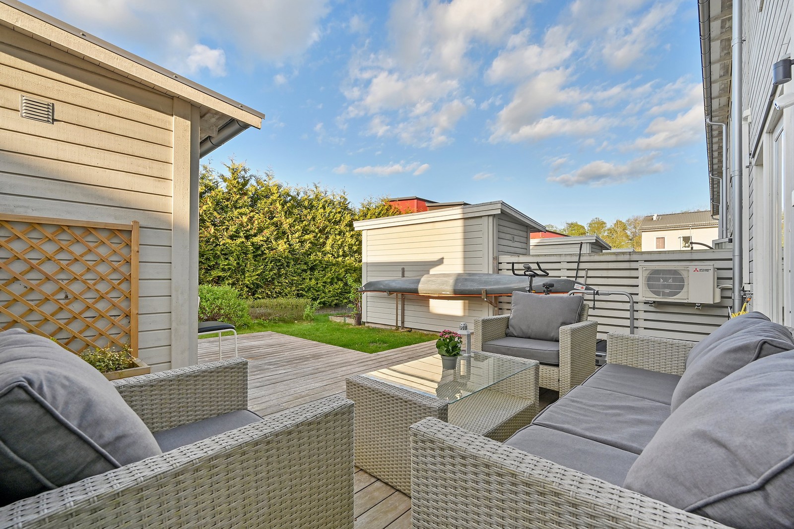 Från vardagsrummet nås bostadens uteplats, där du först möts av ett trädäck med gott om plats för utemöbler och matgrupp – perfekt för sommarens grillkvällar. Här finns även ett praktiskt utvändigt förråd. Den tillhörande gräsmattan bjuder in till lek och sociala stunder.