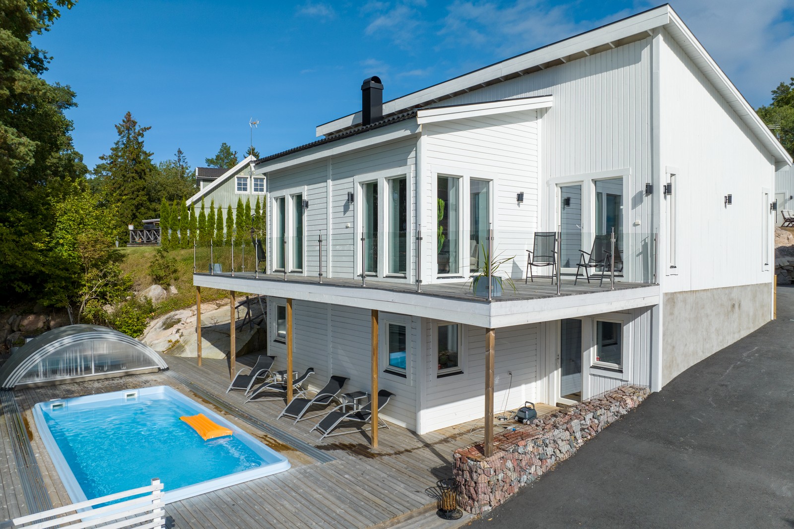 Denna arkitektritade familjevilla uppfördes 2018 med genomgående exklusiva materialval samt med fokus på känsla och kvalitet. Här får du ett riktigt drömboende med en hög teknisk standard, smakfull inredning, generös takhöjd samt härligt ljusinsläpp från stora fönsterpartier från golv till tak. En underbar altan sträcker sig runt huset och erbjuder ett flertal sittplatser med möjlighet att njuta av solen till solnedgången. Dessutom finns ett generöst pooldäck runt poolen på framsidan och ytterligare en trädäckad terrass på baksidan insprängd i det framtagna berget. Här finns även ett Attefallshus perfekt för generationsboende eller för uthyrning.