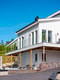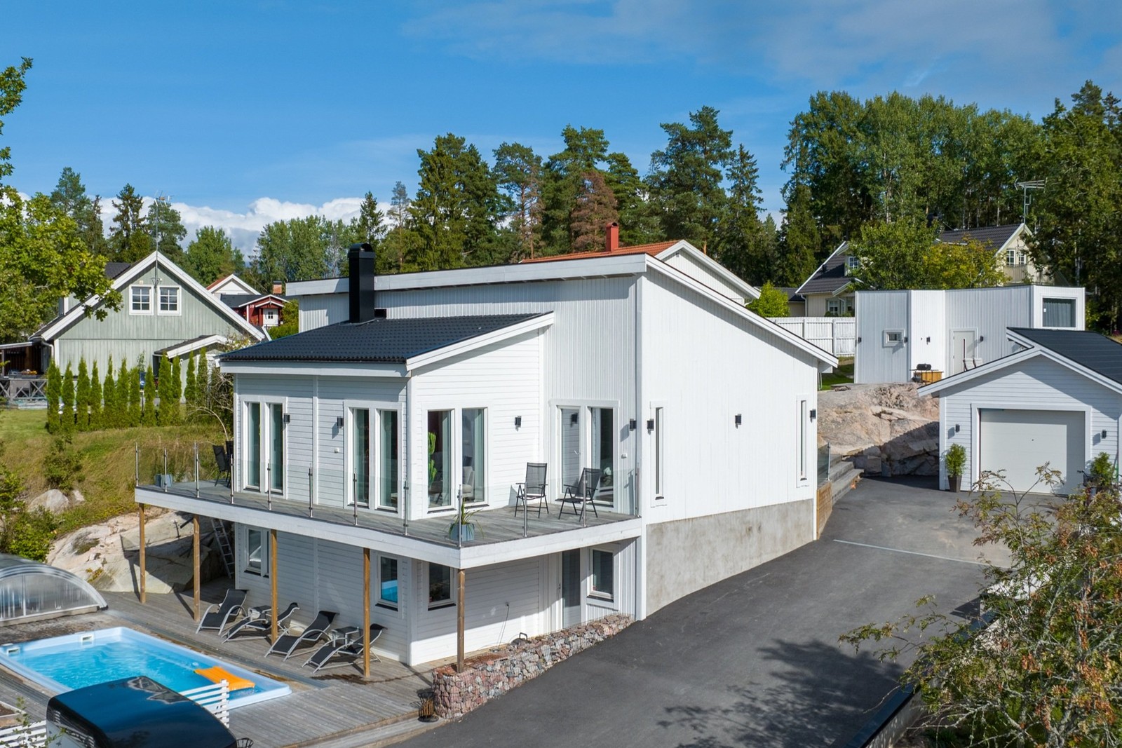 Trädäckad uteplats på baksidan samt balkong på hela framsidan av huset med glasräcke. Stort pooldäck på framsidan runt poolen med perfekt läge för solen.
