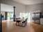 Enstavsparkettgolv och ljusgrå målade väggar och infällda spotlights i taket. Vacker braskamin mellan matplats och vardagsrumsdel som både ger en skön värme och är ett vackert inslag till rummet. Stora fönsterpartier från golv till tak.