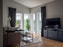 Enstavsparkettgolv, målade väggar och infällda spotlights i taket. Plats för soffgrupp och tv-hörna.