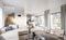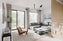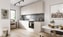 Modernt och välplanerat arbetskök med vitlaserat parkettgolv och stilren köksinredning i en ljusbeige kulör. Grå arbetsbänk och stänkskydd i matchande material skapar ett sobert helhetsintryck. Fullt utrustat med spishäll, inbyggnadsugn, fläkt, integrerad diskmaskin samt kyl och frys. Den öppna planlösningen mot vardagsrummet och matplatsen gör köket perfekt för både vardag och sociala tillställningar.
