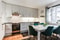 Ljust och modernt kök med parkettgolv och vita väggar. Vita köksluckor och vitt kakel ger ett stilrent intryck. Full maskinell utrustning med spishäll, fläkt, ugn, mikro, diskmaskin samt kyl och frys. Matplatsen ligger trevligt intill fönstret med fint ljusinsläpp.
