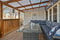 Rymligt rum med plats för stor soffgrupp, på ena väggen finns akustikpanel. Utgång till takförsedd altan och vidare ut till gräsmatta. Tre fönster och altandörr.