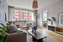 Stilrent kök med vita köksluckor och vitt kakel ovan den ljusträfärgade bänkskivan. Köket är utrustat med rostfri kyl/frys samt häll, fläkt, ugn och diskmaskin. Parkettgolv och ljusa väggar bidrar till en ljus och trivsam atmosfär. Intill köket finns en rymlig matplats med plats för cirka 4–6 personer.