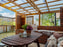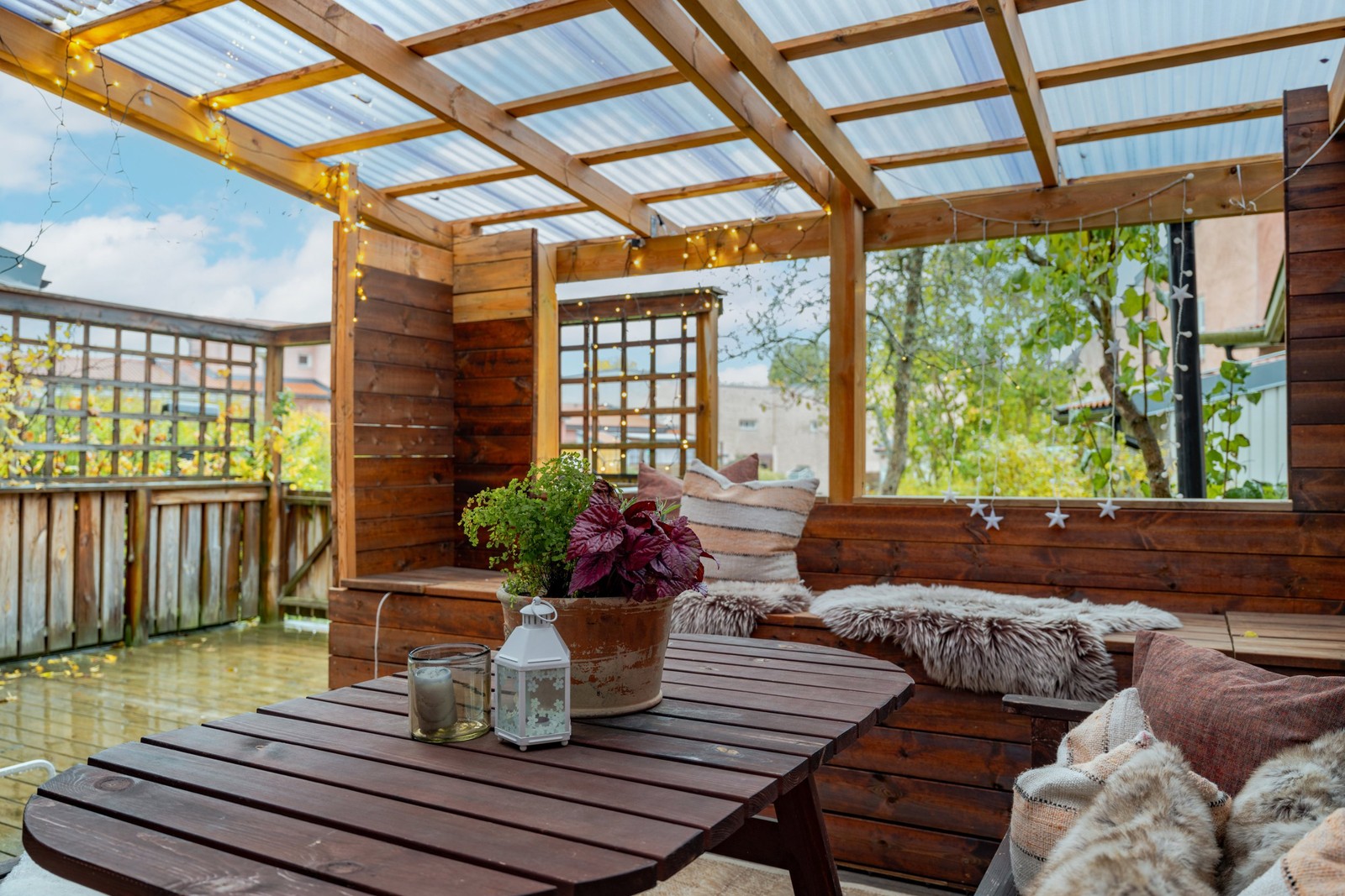 Uteplats på baksidan med utgång till föreningens gräsytor med plats för lek.