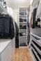 Välplanerad hall med plats för skor och ytterkläder utmed vägg samt ytterligare förvaring i platsbyggd skjutdörrsgarderob. Säkerhetsdörr.