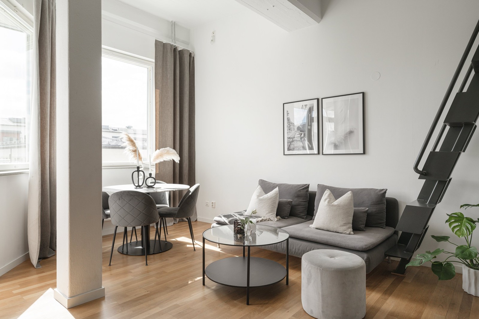 Hallen övergår i ett vardagsrum med en härlig rymd i och med den tilltagna takhöjden. Det rika ljusinsläppet i kombination med de smakfullt bevarade detaljerna i bärande konstruktioner ger rummet en industriell karaktär likt en konstnärsateljé. Här samsas soffa och soffbord i anslutning till angränsande matplats och kök. Rummet har access till övriga rum inklusive balkong och loft.