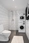 Badrummet är helkaklat med industriell touch i och med det mörkt fogade vita kaklet som bryter av mot det mattgråa klinkergolvet med underliggande golvvärme. Här samsas handfat nedfällt i kommod med WC, dusch samt tvättmaskin och torktumlare.