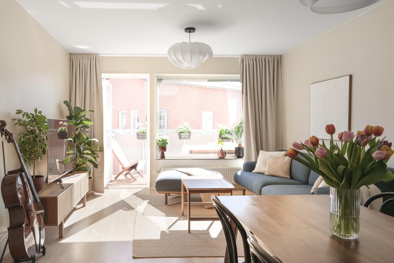 Vardagsrummet disponeras i öppen planlösning mellan kök och vardagsrum, vilket öppnar upp för ett flexibelt disponerade av ytorna med både soffgrupp och övrigt möblemang. Rikt ljusinsläpp samt utgång till den angränsande balkongen som blir en naturlig förlängning av rummet under sommarhalvåret.