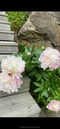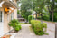 Charmig kuperad tomt med vackra planteringar. Här samsas klematis, hägg, pionbuske, tujjahäck, avenbokhäck och doftande drärgsyrenhäck.
