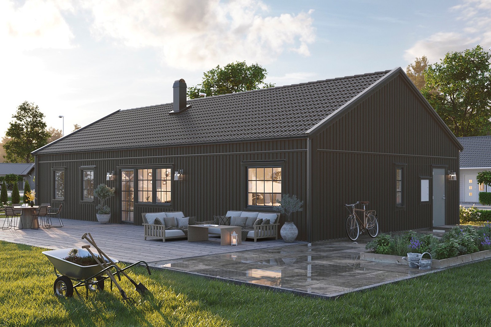 Förslag på husmodell är Villa Vallda i modern stil. Ett 1-planshus på 126 välplanerade kvadrat där alla får utrymme att trivas.