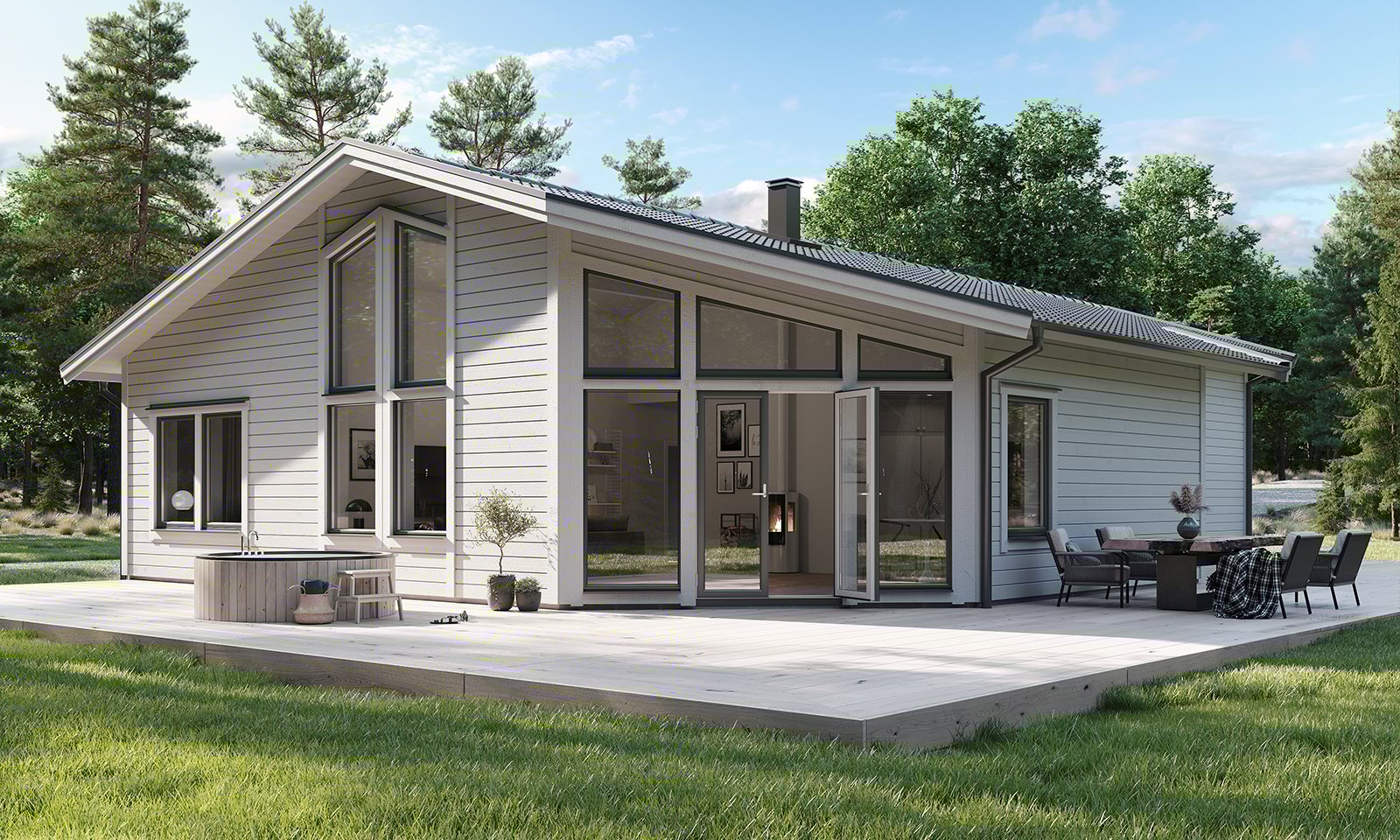 Husförslag villa Vinga är ett modernt och formsäkert enplanshus på 140 kvm där vinklarna skapar en ljus och öppen planlösning. Med sina monumentala glaspartier och ståtliga ryggåstak är det vardagsrummet som står ut i Villa Vinga. Här står dörrarna mot uteplatsen öppna på sommaren och när dagen ebbar ut är det härifrån du blickar ut över solnedgången. Den öppna planlösningen gör det lätt att trivas i köket, och genom hela huset finns det generöst med utrymme – med ett stort badrum, generös klädvård, rymlig entré och ett härligt sovrum med såväl ryggåstak som egen klädkammare. Och barnen får sitt eget avgränsade krypin att hänga i.